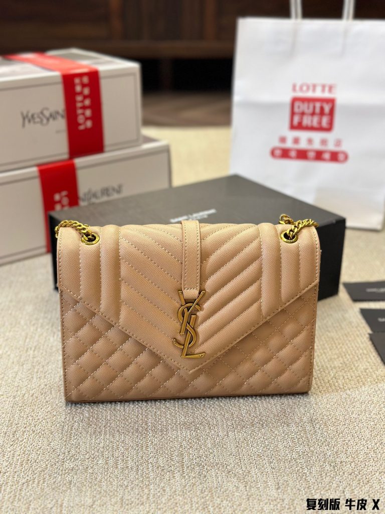 Real photos of YSL bag ENVELO bag. Today I will update you with the envelope design of ENVELOPE bag, which is simple and fashionable with gold or silver chain. The square shape of the bag exudes a mature temperament, suitable for commuting and if you prefer a slightly larger capacity, you can carry it on the shoulder or cross-body. Grained cowhide, wear-resistant and easy to care for. Size: 24 18cm