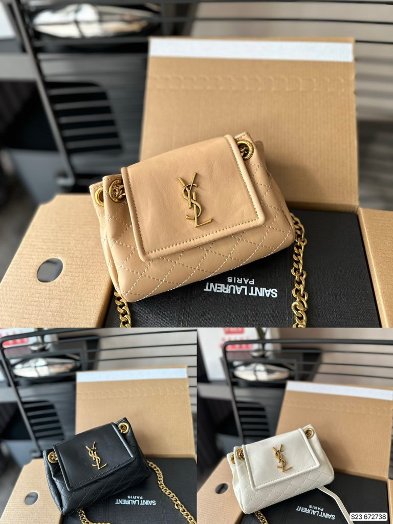 The Monogram nolita handbag has a front flap decorated with a metal interlocking ysI letter logo and diamond-shaped quilted seams. It comes with a chain and leather strap and can be carried in two ways.