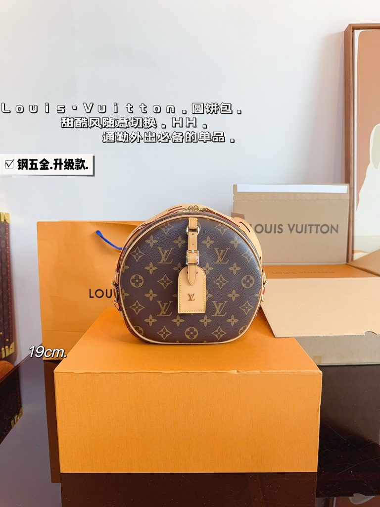 LV apple bag round cake bag The classic Louis Vuitton hat box has been transformed into this cute style carry-on pouch. Compact and practical, dual version design: classic Monogram canvas with cowhide trim; trendy Reverse Monogram canvas with trim. Size: 19*8*