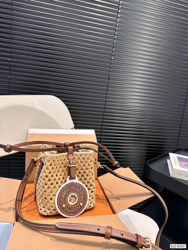 The Noe Purse bag is crafted in crocheted raffia with leather trim and a drawstring inspired by the Noe bag to secure its delicate structure. The shoulder strap and Louis Vuitton patch are both removable, allowing for a variety of carrying and styling options. Size: 12 12 Item No. 8