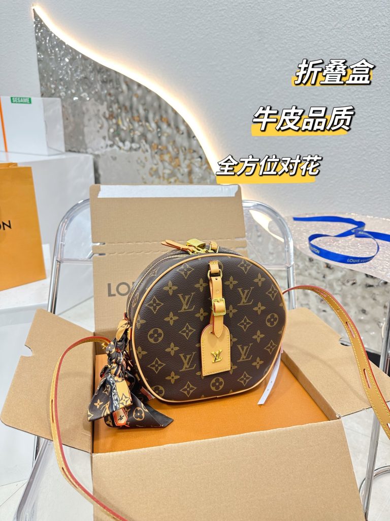 Lv soft round cake show style limited edition hat bag small round bag crossbody handbag ready stock crossbody bag new arrival made of Monogram and Monogram Reverse canvas, with calfskin trimming, a romantic and unrestrained trendy style, The ideal accessory for day and evening looks. size: