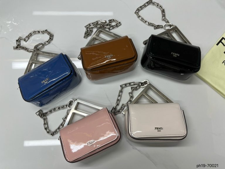 Clutch made of patent leather, decorated with large F-pattern metal accessories and chain, with metal FENDI Rorma lettering on the flap. Short chain handle, can be used as a clutch or handbag. Size: 13 9 Item No. 7